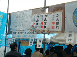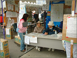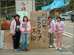 次に訪れたのは、震度7を記録した川口町災害ボランティアセンター。まだ水道も復旧されておらず、暖房も十分ではなかったため、本部スタッフも、ボランティアも助け合って活動をしていました。(11/13現在) 全国からのボランティアは街なかの地理がわかりません。そのボランティアに、交替で場所案内をする被災地の方々の姿が見られました。 この日の川口町のボランティアは、804人。「震度7と聞いて、まず川口町で活動したかった」という遠方からの長期滞在ボランティアが大勢いました。 |